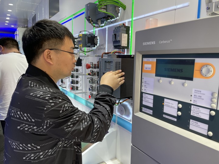 輛集裝箱大卡車別出心裁地裝飾成移動的“會展中心”,印有西門子標志的旗幟迎風飄揚,車身“共創(chuàng)智能基礎設施新生態(tài)”幾個大字格外醒目。